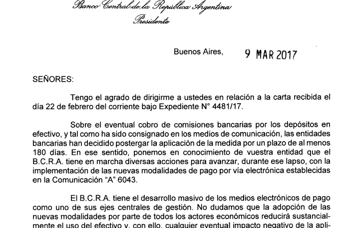 El Banco Central comunicó oficialmente a la CECHA la postergación del cobro de comisiones bancarias por depósitos en efectivo por un plazo de 180 días. A continuación, copia de la carta enviada por la entidad.