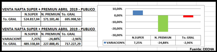 Respecto a lo ocurrido en el cuatrimestre, el consumo general acumula una baja del 1.35 por ciento respecto a 2018. En este lapso la demanda de nafta Grado 3 se derrumbó 24.33 por ciento.