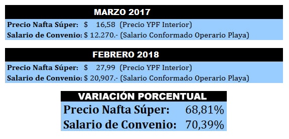 Nota: Para facilitar el cálculo se tomó el precio de la Nafta Súper como combustible de referencia. En el caso de los sueldos resta incorporarse la cláusula de revisión.