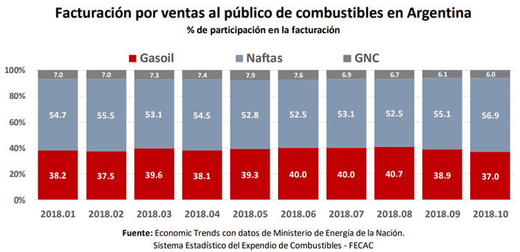 Economics Trend señaló que en este contexto la facturación total de las estaciones por venta al público de combustibles líquidos (gasoil y naftas) y GNC, durante octubre de 2018, fue de $ 41,153.1 millones (sin impuestos), un 95.7 por ciento por encima del monto facturado en octubre de 2017, y del 44.4 de inflación registrada en el país durante el periodo.