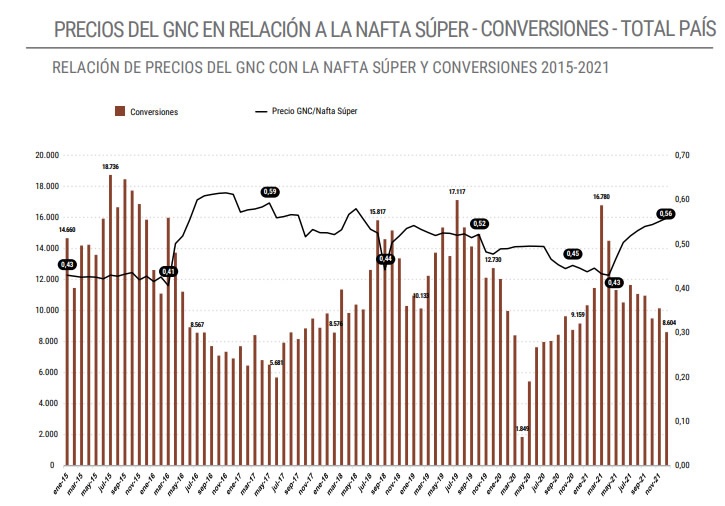 El informe establece asimismo, que cuando el precio del GNC respecto de la nafta súper disminuye, las conversiones de vehículos se incrementan; y cuando el precio del GNC en relación a la nafta súper se incrementa, la cantidad de conversiones de vehículos a GNC disminuye.