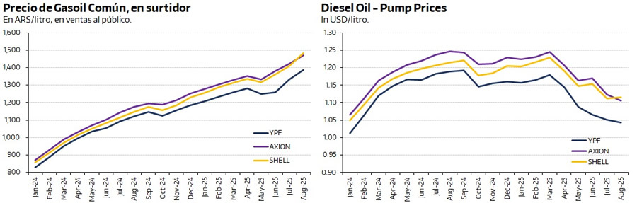 Por ejemplo, los precios del gasoil común muestran un recorrido descendente en los últimos meses, luego de haber alcanzado su techo en julio de 2024, cuando promediaban los 0,93 dólares por litro. Desde entonces, las pizarras marcan una tendencia a la baja que llevó en julio de 2025 al gasoil de YPF a ubicarse en torno a los 0,77 dólares.