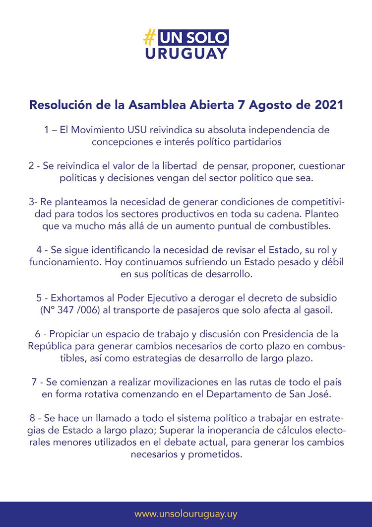 “El movimiento Un Solo Uruguay cree que hay que hacer cambios fundamentales,” y opina que “a través de los combustibles no se puede seguir subsidiando empresas y sectores que ponen en jaque a través del monopolio a muchos uruguayos”.