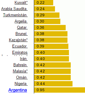 En América Latina el precio de combustible oscila entre US$ 0,55 (Ecuador) y US$ 1,41 (Uruguay) por litro. Si en Venezuela se calcula el dólar al precio del mercado paralelo -de poco más de 1.000 bolívares por dólar-, en este país se llenaría 250 veces el tanque de un automóvil promedio.