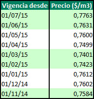 El importe, de 0.7763 pesos por metro cúbico de de 9300 kcal, corresponde al mes de julio y, de acuerdo a la normativa, tiene relación a lo acontecido con el precio promedio ponderado, sin impuestos, país en planta de la nafta súper durante el mes de mayo.
