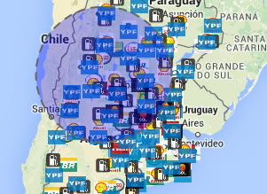 Se mostrará un círculo de color azul e inmediatamente se desplegará un cuadro con las estaciones de servicio de esa región. Con sólo puntear el + que se encuentra a la izquierda de cada firma se visualizarán los antecedentes de cada empresa.
